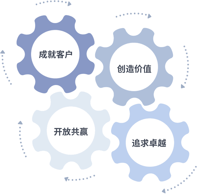 成就客户是一切决策的出发点,,,创造价值是衡量所有工作的标准,,,,追求卓越是我们做事做人的态度,,,,开放共赢是我们的格局也是最终的结果。。。价值观的齿轮环环相扣,,,推动着组织里的每个人不断向前。。。