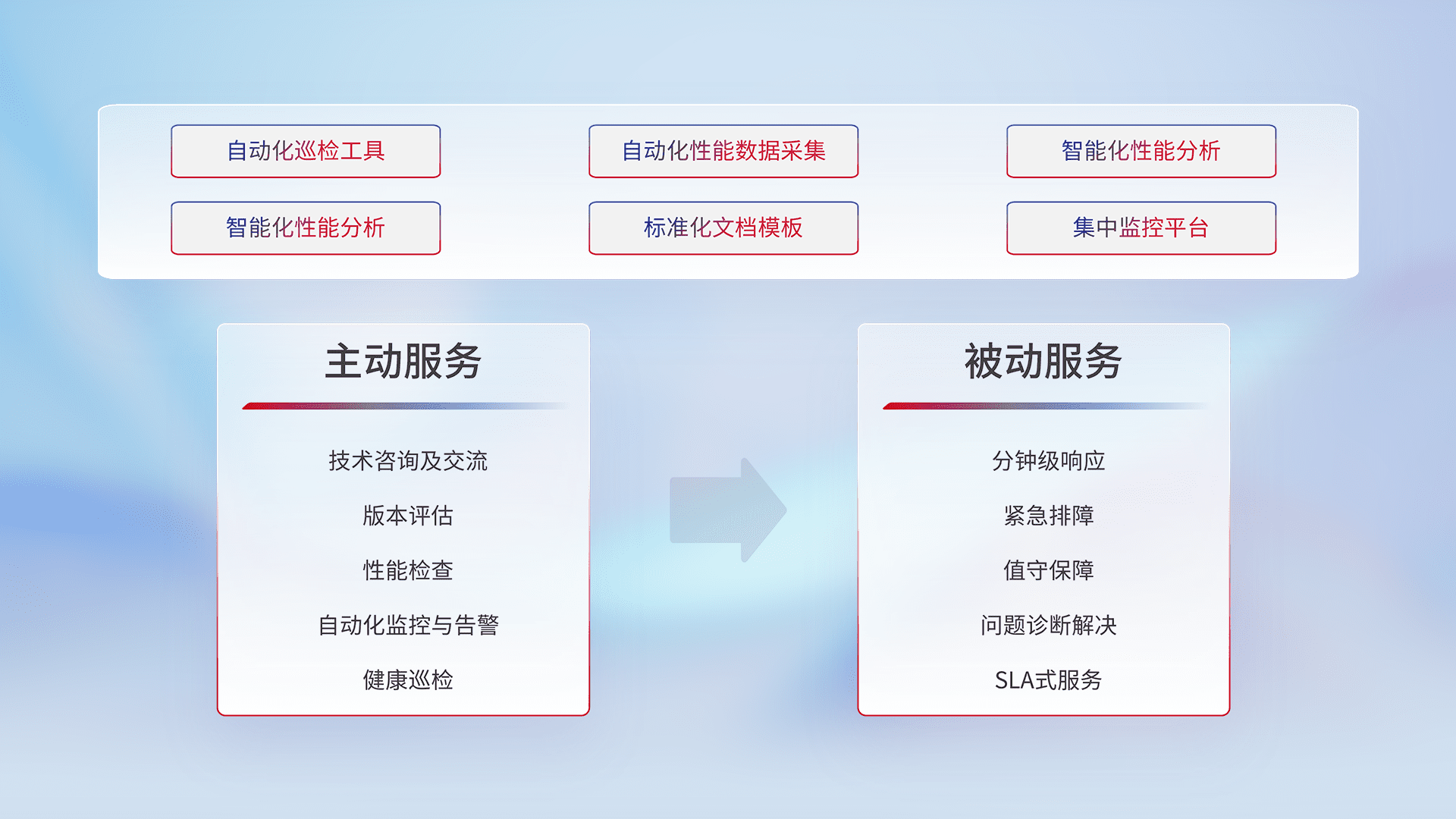 智能化工具和标准化文档,,,保障服务质量,,,,提供主动服务(包含技术咨询、、版本评估、、、性能检查、、自动化监控与告警、、、健康巡检)和被动服务包含(分钟级响应、、、紧急排障、、、值守保障、、、、问题诊断解决、、、SLA服务)。。。。