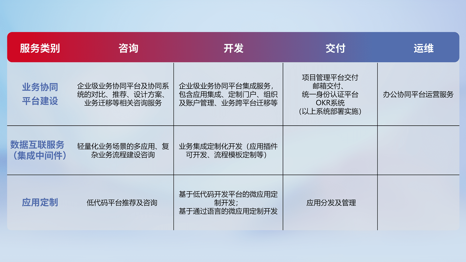 针对钉钉、、、、企微、、、、IDaas等平台级产品提供产品的规划、、、、方案、、、交付、、、定制化开发等服务,,实现如统一协同办公、、、、智能客户服务、、、混合会议管理、、智能数据查询、、、等业务场景,,,实现数字化转型。。